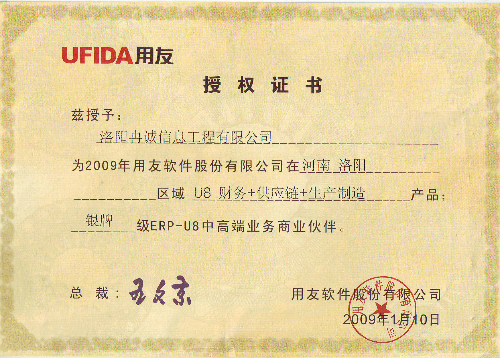 用友2009年銀牌授權證書